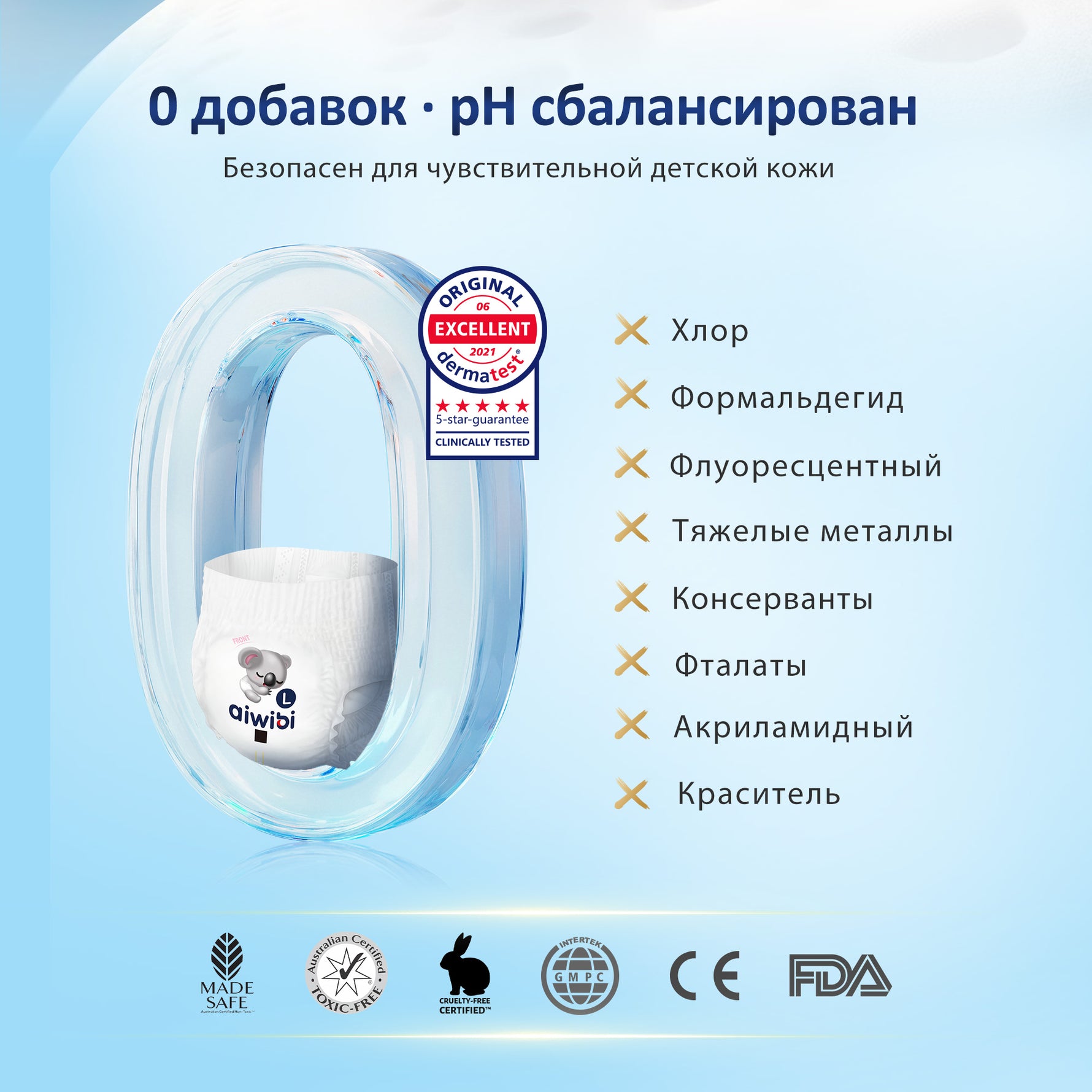 - Подгузники Aiwibi сертифицированы Немецким дерматологическим институтом Dermatest, что означает, что они нежны к коже вашего ребенка. Мы не добавляем никаких отдушек, экстрактов, красителей или других химических веществ, чтобы гарантировать отсутствие запаха и гипоаллергенность подгузников.